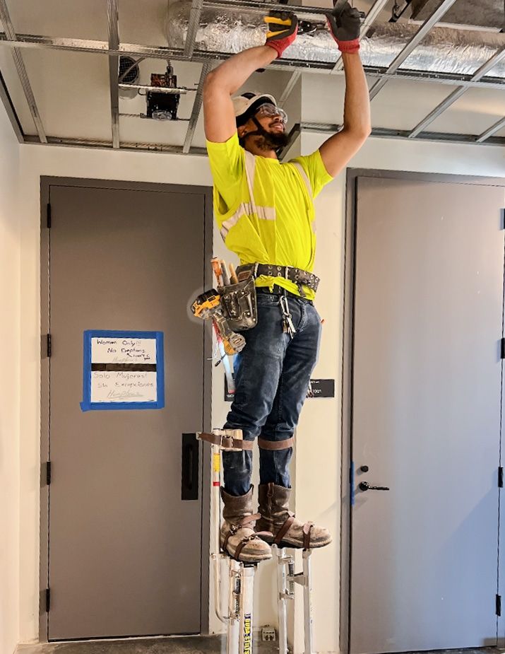 “Miguel was eventually accepted into [Anning-Johnson’s] in-house training program and he consistently did a good job,” Parra continues. “He learned to walk stilts and found a niche for himself by becoming familiar with the high-demand ceiling installation and stilts skillsets.”